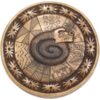 Our intricately hand carved, alabaster-like circular stone tile featuring the sacred Inti and Mamakilla, Sun and Moon. Shown in bas relief, they are surrounded by symbols of the 12 sacred apus,, or mountains, and other Andean symbols. The symbols on your tile may differ slightly from photo. Expertly carved by shamanic artists, Abelaro and Luz Marina in Peru.
