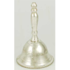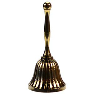 A clear toned brass bell with decorative scalloped outer bell and slender handle. Brass. 4”