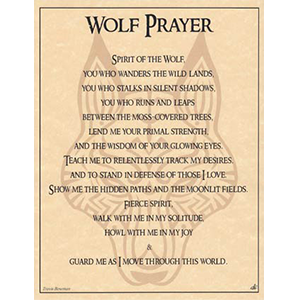 This parchment poster offers a shamanic prayer to the spirit of the wolf, for guidance, strength, and protection throughout your journey in the wilds of life. 8 1/2″ x 11″